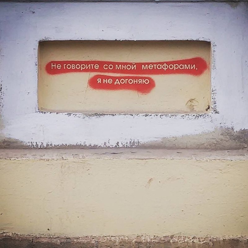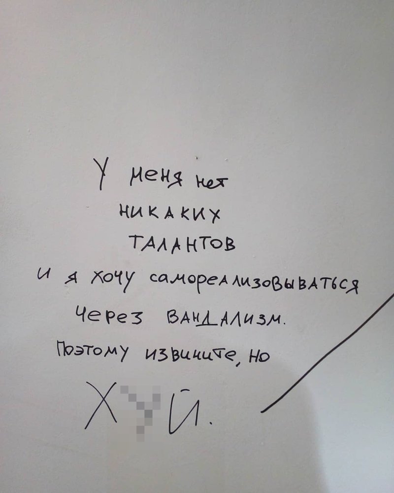 20 по-настоящему забавных примеров вандальных надписей (20 фото) 17 февраля 2019 0 Категория: смешное Если захочется испортить фасад очередного дома или гараж, то придумайте что-нибудь, что будет не хуже надписей из данной подборки. Возможно стоит сделать такие надписи на фасаде всех отделений? Порция уличной мудрости Кто-то почти удачно замазал частицу "не" Так и делаю Продолжение ннннадо? Поделитесь новостью с друзьями: Facebook Twitter Pinterest +2