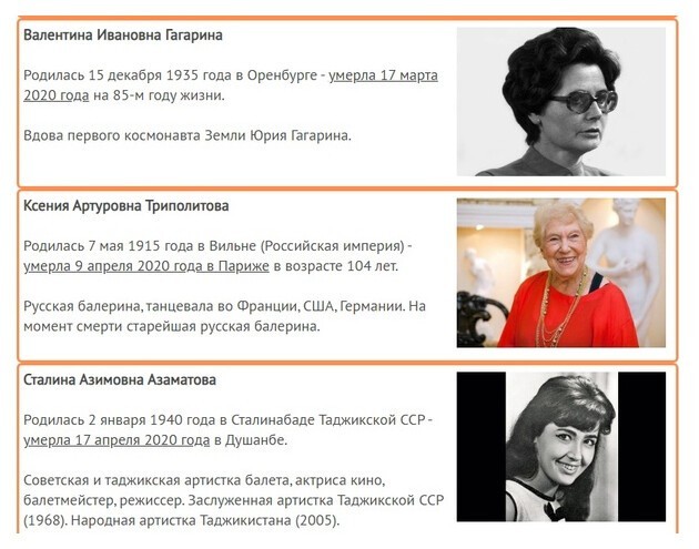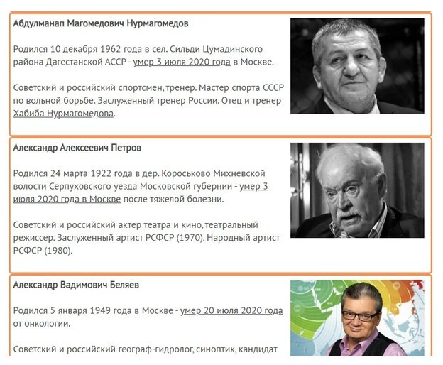 Кого из российских знаменитостей забрал с собой 2020 год (10 фото) 12 февраля 2022 0 Категория: знаменитости Список имен тех, кого с нами больше нет... Поделитесь новостью с друзьями: Facebook Twitter Pinterest 0