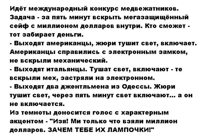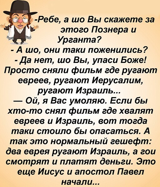 Жизнь человека тяжела, но юмор помогает возвыситься над буднями и увидеть неожиданный выход из трудной ситуации. Можно, не преувеличивая, сказать, что юмор помог выстоять еврейскому народу, утвердил его жизнестойкость. В подборке смешные приколы про евреев.