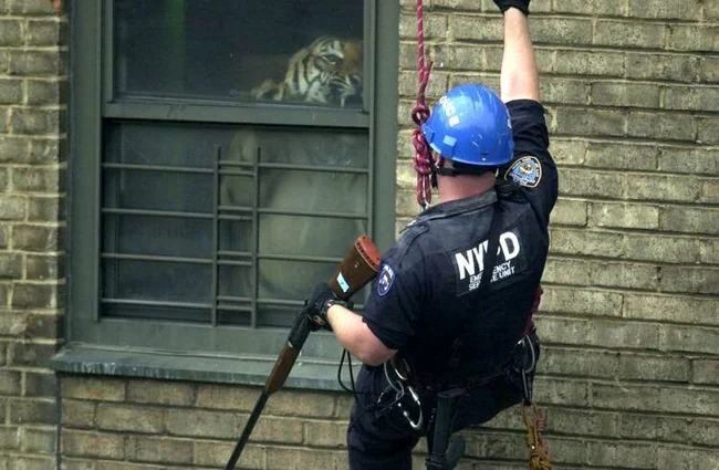 Офицер полиции Нью-Йорка смотрит на Минга, тигра весом 160 кг, которого тайно держали в квартире Гарлема, 2003 год