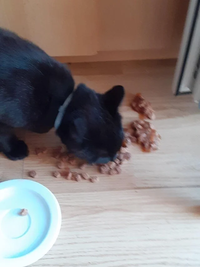 Вместо того, чтобы есть из миски, он вываливает корм на пол и слизывает только соус