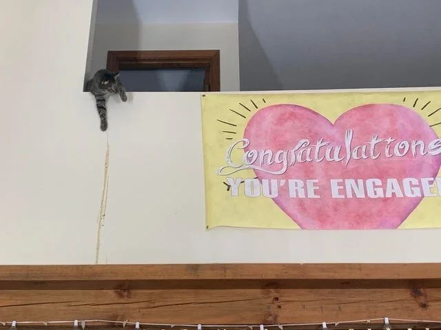 Надпись на плакате: «Поздравляем с помолвкой».