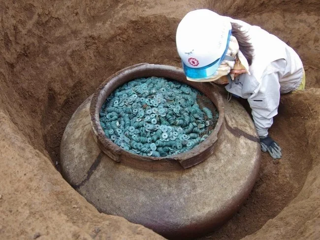 Предположительно, этот клад был спрятан в XV веке. Его обнаружили на территории резиденции самураев к северу от Токио.