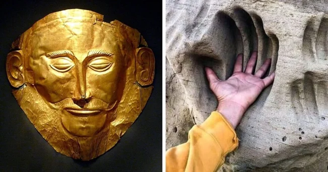 Это золотая погребальная маска, обнаруженная в древнегреческих Микенах. Современные археологические исследования показывают, что маска датируется около 1600 годом до нашей эры.