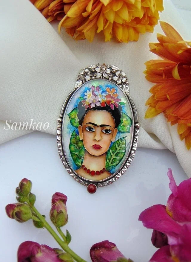 Подвеска «Фрида Кало» выполнена в технике перегородчатой эмали и помещена в серебряную оправу.