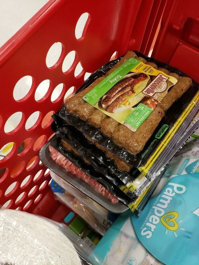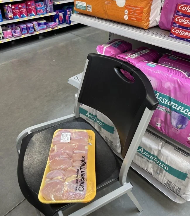 По всей видимости, кого-то настигла внезапная необходимость, и ему пришлось выбирать между мясом и подгузниками для взрослых. Кстати, этот лоток курицы стоил 18 долларов! ????