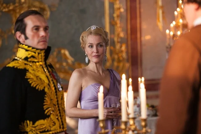В сериале "Война и мир" Джиллиан Андерсон сыграла Анну Павловну Шерер. По поводу актрисы ничего плохого сказать нельзя, потому что Джиллиан была на экране в своем репертуаре - неповторима и идеальна. Но вот один костюм ее героини вызвал закономерный вопрос. Она носила платье с глубоким вырезом в спине и без одного рукава. Сейчас это вполне обычное платье, но в то время его еще никто не носил.