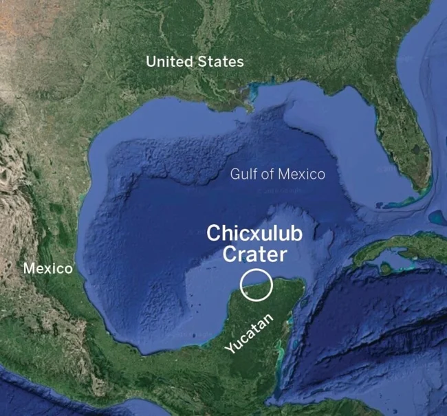 Геологи нашли место падения метеорита – кратер диаметром в 180 км на полуострове Ютакан в Мексике в 1978 году совершенно случайно во время геофизических исследований на дне Мексиканского залива: команда исследователей обнаружила подводную дугу протяжённостью в 70 км в форме кольца, а продолжение этой дуги было замечено на суше, на северо-западе полуострова. Вместе дуги складываются в окружность диаметром в 180 км. Ударное происхождение этого кратера было доказано по гравитационной аномалии внутри кольцеобразной структуры, а также по присутствию горных пород, характерных только для ударно-взрывного породообразования, этот вывод подтвердили также химические исследования грунтов и детальная космическая съёмка местности.