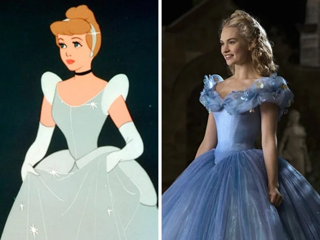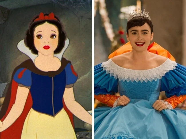 У Диснея нет кино про Белоснежку, поэтому можно сравнить принцессу из мультфильма с главной героиней фильма «Белоснежка: Месть гномов», вышедшего в 2021 году. Белоснежку там сыграла Лили Коллинз.