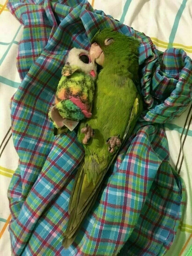 Даже у попугаев могут быть любимые игрушки, с которыми им нравится спать и обниматься