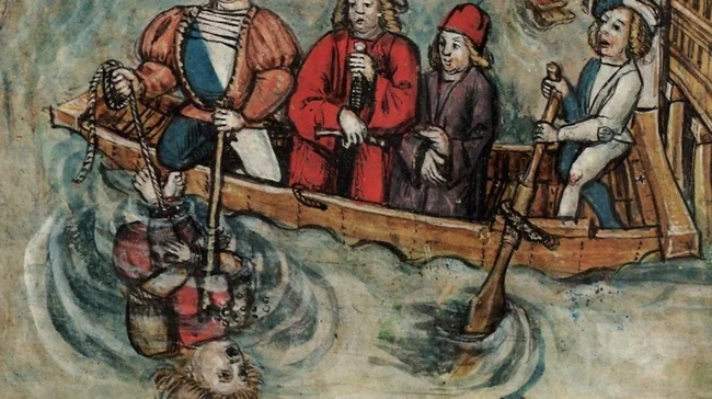 На «испытании водой» обвиняемого связывали и бросали в водоем и если он не шел ко дну, то был виновен и подлежал казни. Считалось, что вода, стихия чистоты, не примет «нечистого человека».