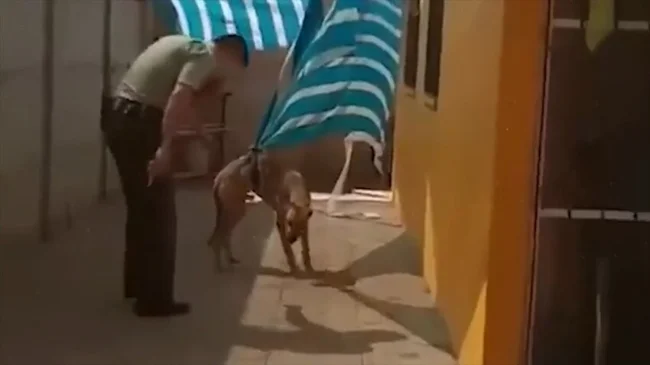 Щенок запутался в тенте. Он громко кричал и звал на помощь, и вдруг к псу подошел офицер полиции и схватил ткань. Это было непросто, но мужчина смог отрезать кусок тента и освободить беднягу, который сразу же встал на задние лапы и обнял своего спасителя.