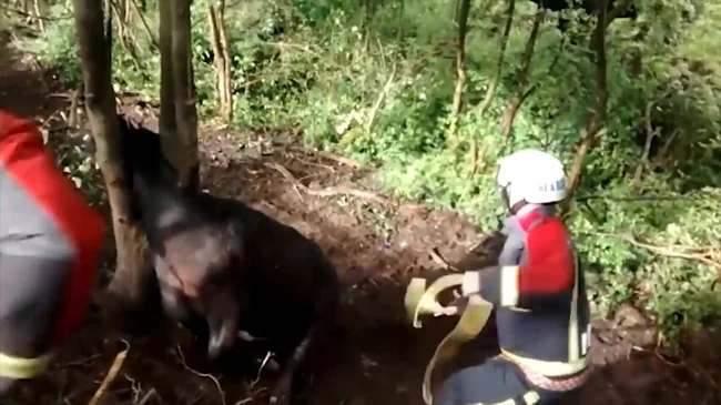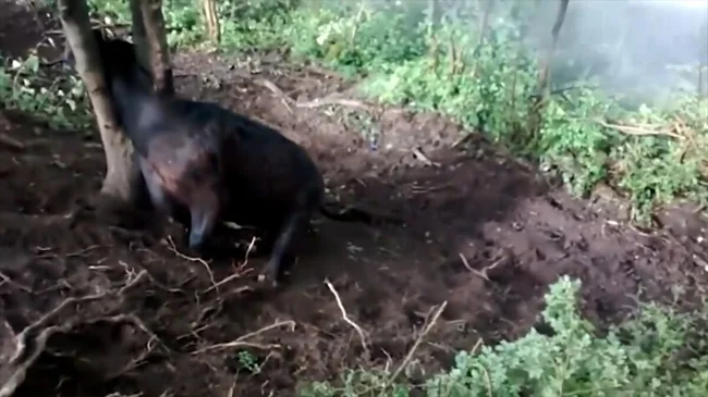 А сейчас вы видите команду спасателей, которая идет на помощь корове. Ее голова застряла в дереве. Но это не единственная проблема. Животное не может двигаться, а еще есть риск нападения быков. Их отгоняют мощными струями воды из брандспойта.