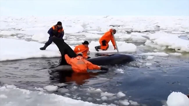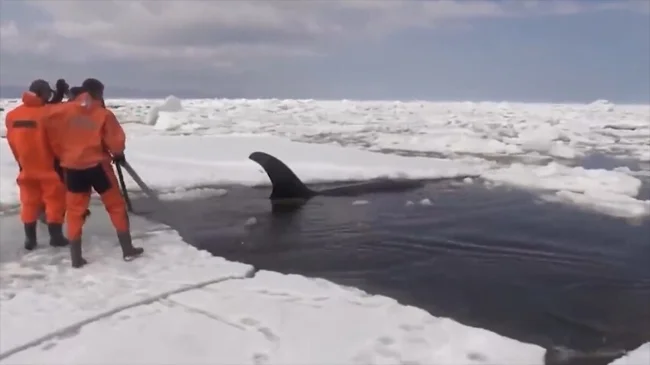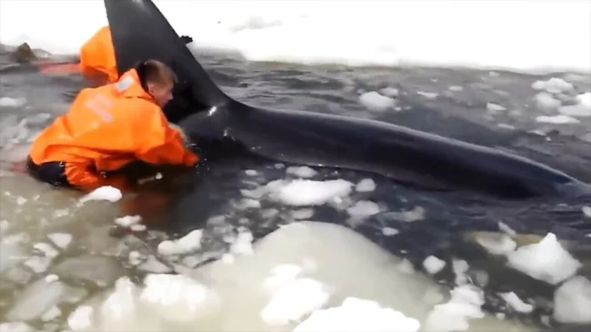4 касатки застряли во льдах, две из них – в почти недоступных местах. Лед стал сжиматься, сдавливая животных, которые стали звать на помощь. Для спасателей, дайверов и волонтеров было важно сдвинуть глыбы льда, чтобы касатки не получили ледяные ожоги.