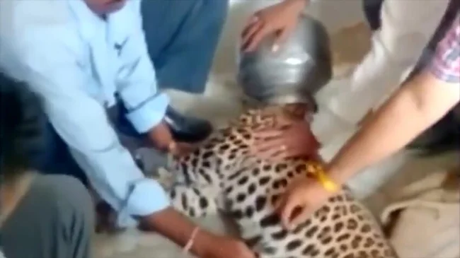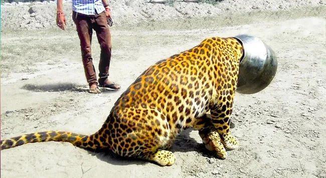 Леопард, мучимый жаждой, искал воду в иссушенной пустыне в штате Раджастан, Индия. Его голова застряла в кувшине. В таком положении хищника и нашли люди.