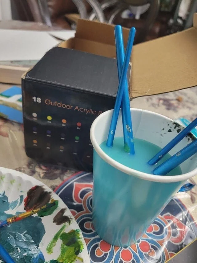 Цвет воды, в которой стоят кисти соответствует цвету стакана