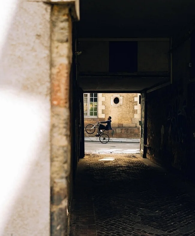 В объектив попал юноша, выполняющий трюки на велосипеде.