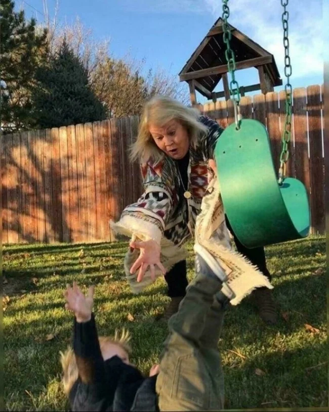 Бабушка пытается поймать своего внука, упавшего с качелей