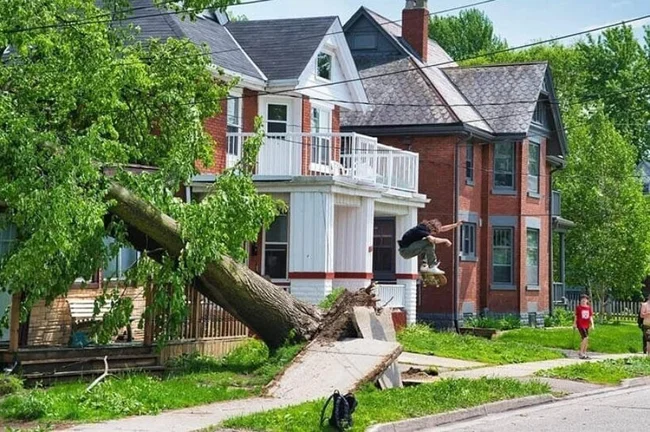 Разрушения, вызванные стихией, несут немало поводов для расстройства. Но есть люди, которые любую ситуацию принимают с оптимизмом. Вот и для этого скейтера разрушенный тротуар и рухнувшее дерево стали отличным трамплином для трюков.