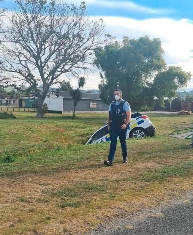 Этот полицейский очень правильно выбрал себе профессию. Его авто оказалось в канаве, а на лице при этом не дрогнул ни один мускул.
