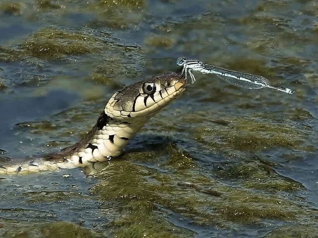 Стрекоза приземлилась прямо на нос змеи, чем немало ее удивила. И кажется, обрадовала.