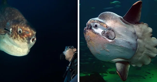 Одна из самых больших костных рыб в мире. Кроме того, у неё полностью отсутствует чешуя, а зубы срощены в своеобразный «клюв». Несмотря на внушительные размеры, луна-рыба не представляет никакой опасности для человека.