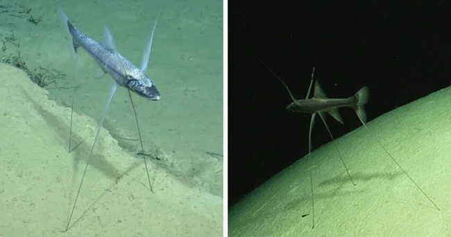 Обитают рыбы-треноги у дна, на глубине от 800 до 5000 метров. Главная особенность существа — его удивительные плавники-лучи, растущие из грудных плавников и хвоста. На них рыба опирается, когда «стоит» у дна. Во время плавания рыба просто расслабляет плавники, чтобы они ей не мешали.