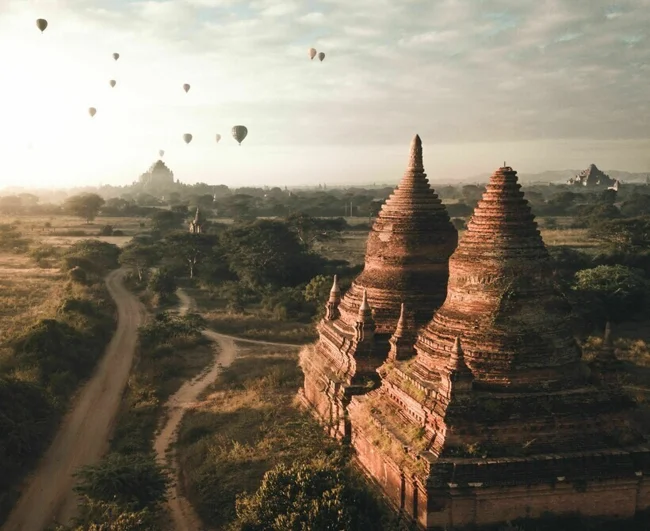 Автор фотографии отдыхал в Мьянме, когда ранним утром заметил воздушные шары, парящие в небе. Благодаря же беспилотнику в кадр вместилось и два величественных храма. Кстати, в огромной долине их более 2000!