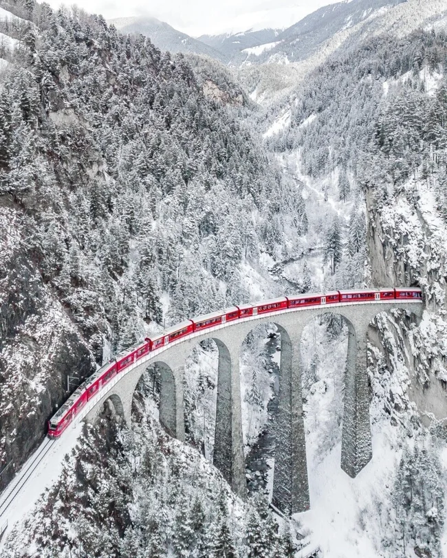 Белоснежные горы Швейцарии настолько монохромны, что красный поезд напоминает яркую атласную ленту, летящую сквозь горы.