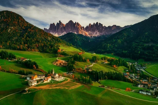 Красочная итальянская деревенька, раскинувшаяся на зеленых холмах.