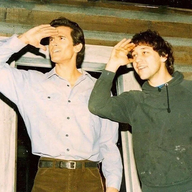 Брюс Кэмпбелл и Сэм Рэйми на съёмках «Зловещих мертвецов 2» (1987)