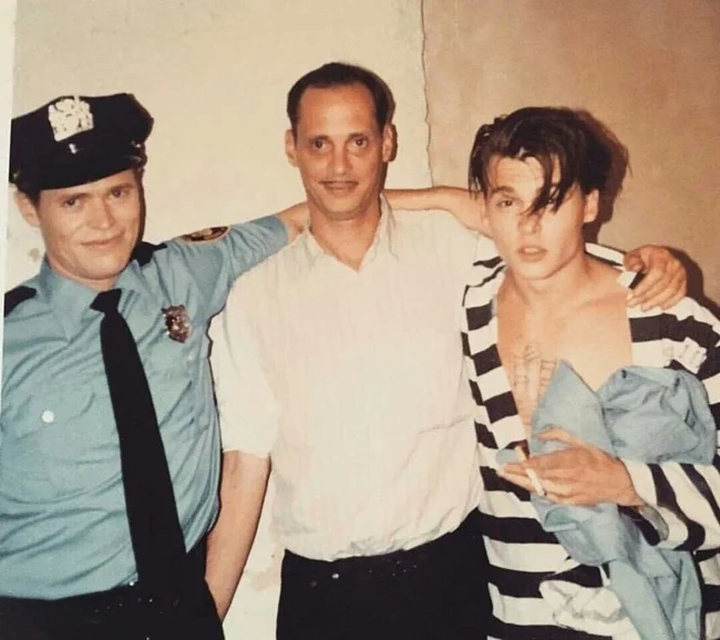 Уиллем Дефо, Джон Уотерс и Джонни Депп на съёмках фильма «Плакса» (1989)