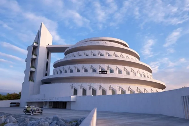 Архитектор Фрэнк Ллойд Райт, 1925 год. Сооружение должно было представлять собой огромный планетарий с куполом, с внешней стороны которого располагалась спиральная площадка для автомобилей.