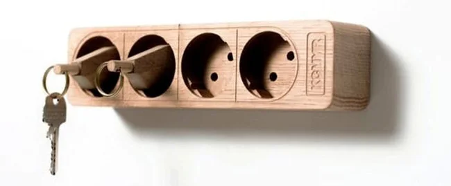 Можно взять неработающий удлинитель и, обрезав шнур, приклеить на его стену. А вилки присоединить к ключам, как брелоки. Раз — и ключики на месте