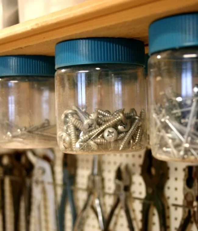 Мелкие шурупы, гайки, гвоздики и саморезы удобно хранить в банках, крышки которых присверлены к нижним поверхностям полок