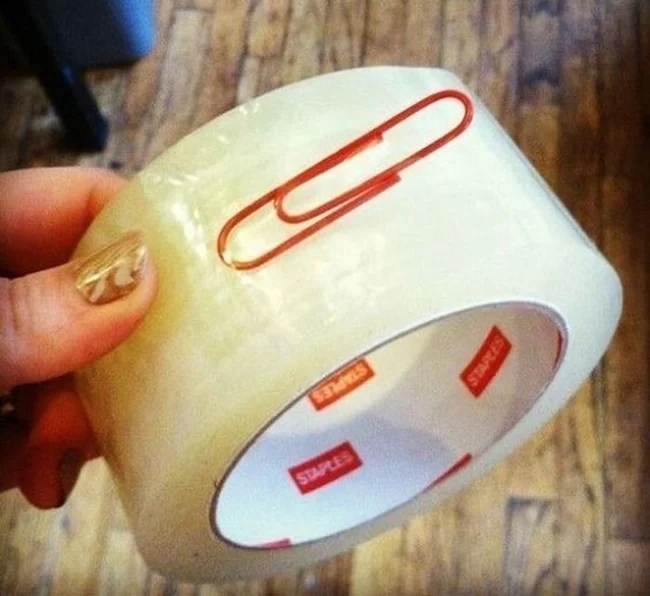 Чтобы удобно пользоваться скотчем, нужно взять простую скрепку. Теперь не нужно долго и упорно ногтем искать начало этой прилипшей ленты
