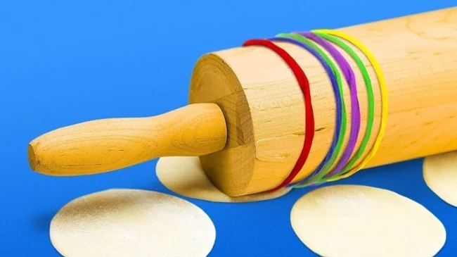 На скалку надеваем несколько резиночек и делаем красивые узоры