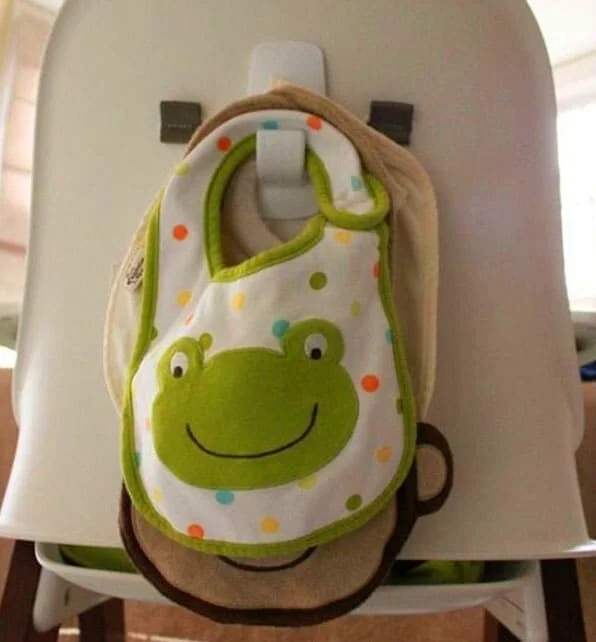Размещаем самоклеящийся крючок для слюнявчика на спинке стульчика для кормления