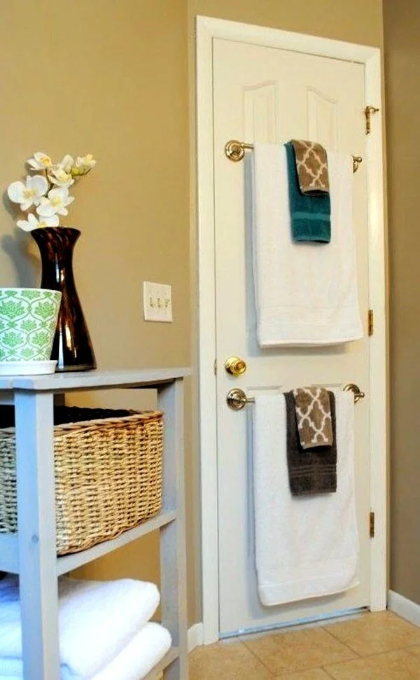 На дверях располагают удобные вешалки, размещая на них полотенца в ванной