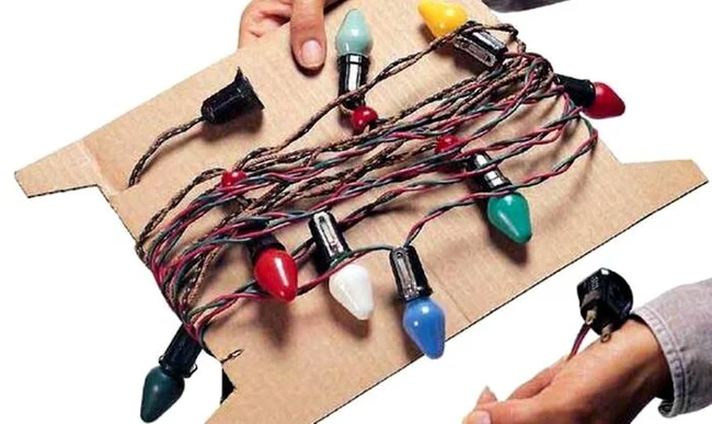 Новогодние гирлянды достаточно просто обмотать вокруг картонной катушки, и никаких нервов при распутывании