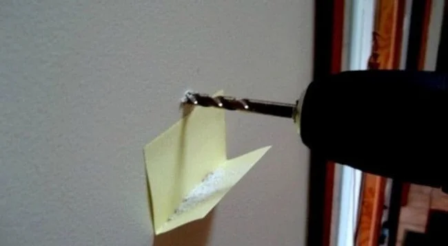 Сверление приносит много пыли, что злит жён и раздражает дыхательные пути у самого зодчего. Пусть пыли станет меньше благодаря тому, что она попадёт на самоклеющийся согнутый стикер