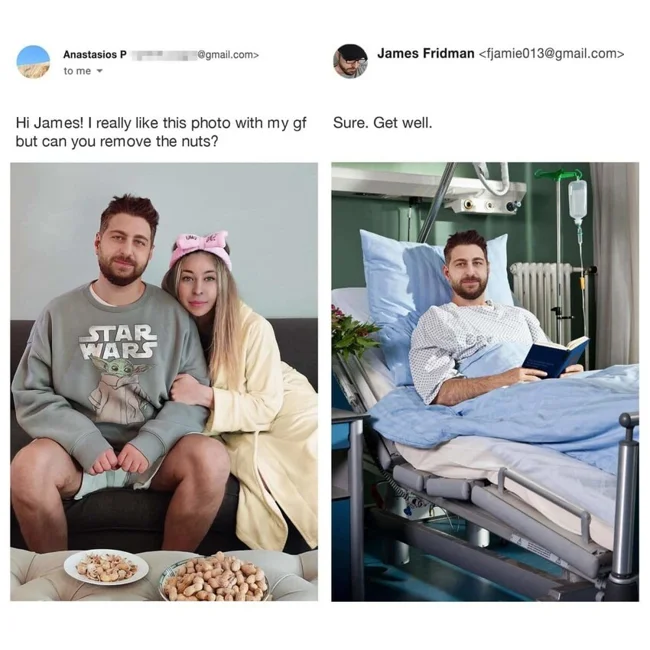 Привет, Джеймс! Мне очень нравится это фото с моей девушкой, но можешь удалить орехи?