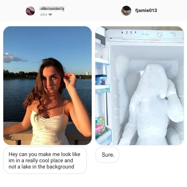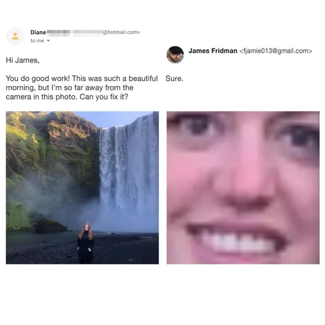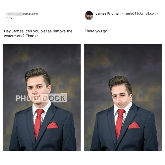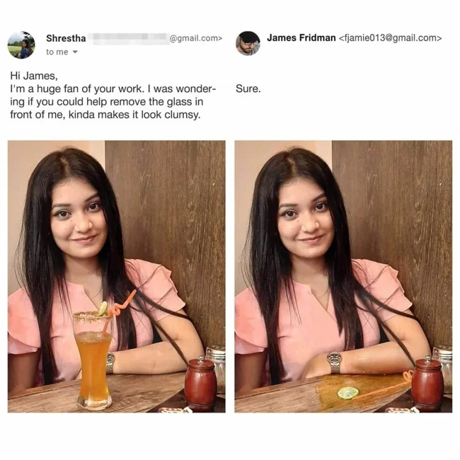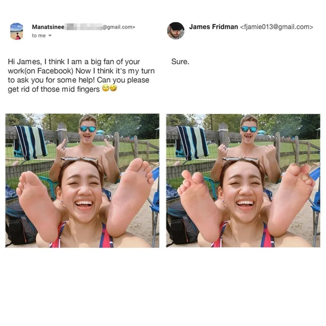 Парень нестандартно подходит к просьбам клиентов, обратившихся к нему за обработкой фотографий. Если в них содержится хоть капля на двусмысленность, фотошопер сделает из снимков смешной шедевр, который будет образцом нетипичного креатива. Если вы за нестандартный подход, то скорее присылайте Джеймсу своё фото. Однако будьте уверены, что и вас он не пощадит.
