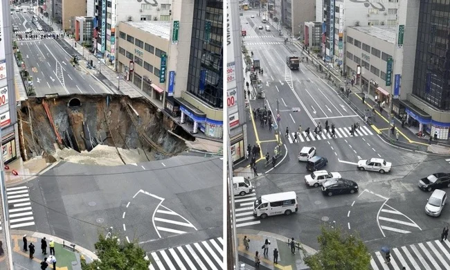 13. До и после ремонта дороги в городе Фукуока