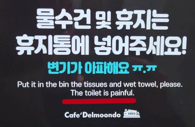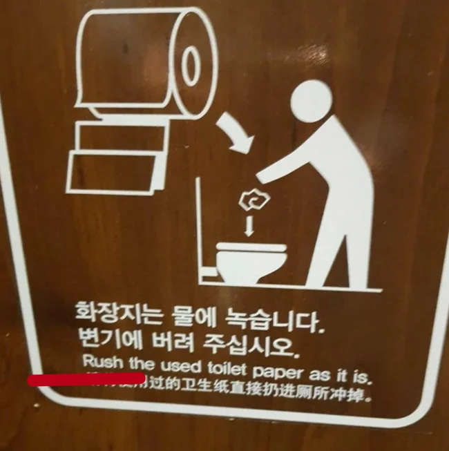 Корейцы любят чистоту в общественных туалетах. Потому стараются дублировать объявления по пользованию для всех иностранцев. Иногда бывает болезненно.