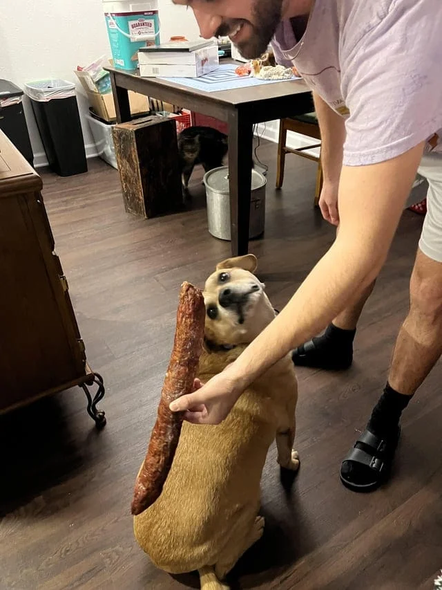 Моя собака в сравнении с размером палки колбасы, которую она стащила с прилавка.