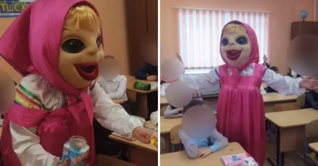 Эта Маша курильщика поздравляла детишек в школе Кемеровской области. Надеемся, что из баночки она раздаёт купоны на скидку к психотерапевту ????