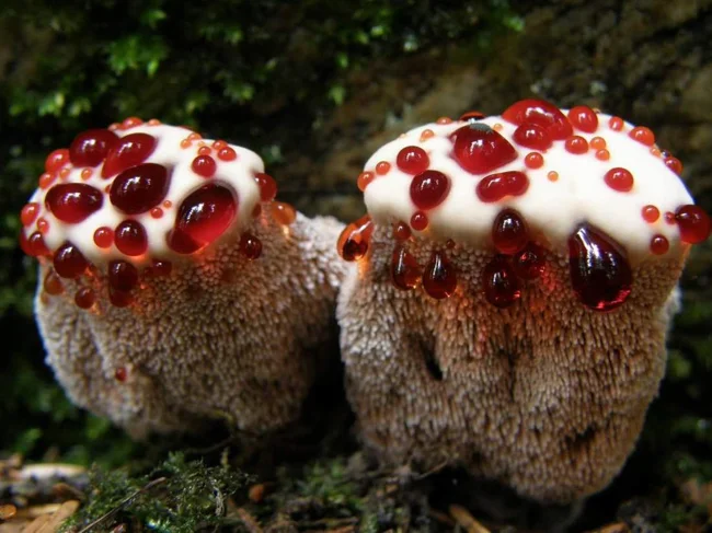 С натяжкой, но всё же в этом грибе можно найти сходство с кровоточащим человеческим зубом. Гиднеллум Пека или Кровавый зуб в тёмное время суток выделяет излишки влаги, накапливающиеся в мякоти. Не является ядовитым, но из-за сильной остроты и горечи в пищу не употребляется.