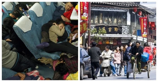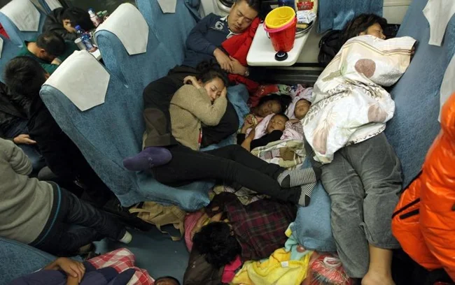 В Китае можно купить билет без места на каждый поезд, даже если дорога до конечного пункта займет пару дней. Поэтому пассажиры часто просто лежат на полу в проходе.