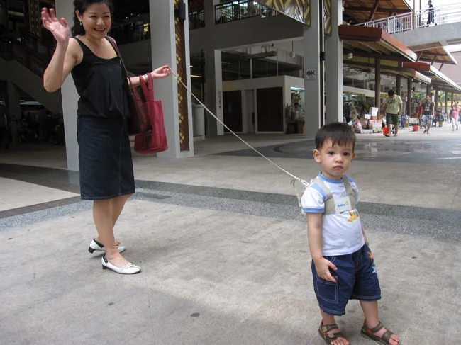 Здесь повсеместно можно увидеть, как родители держат на улице поводок со своим ребенком. Это - мера безопасности, так как в Китае часто пропадают дети.